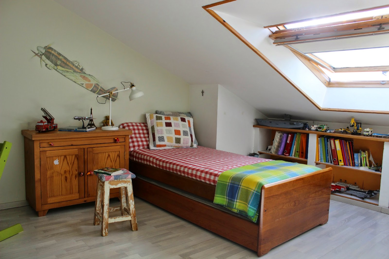 O quarto dele é um encanto. Linda essa janela no telhado.