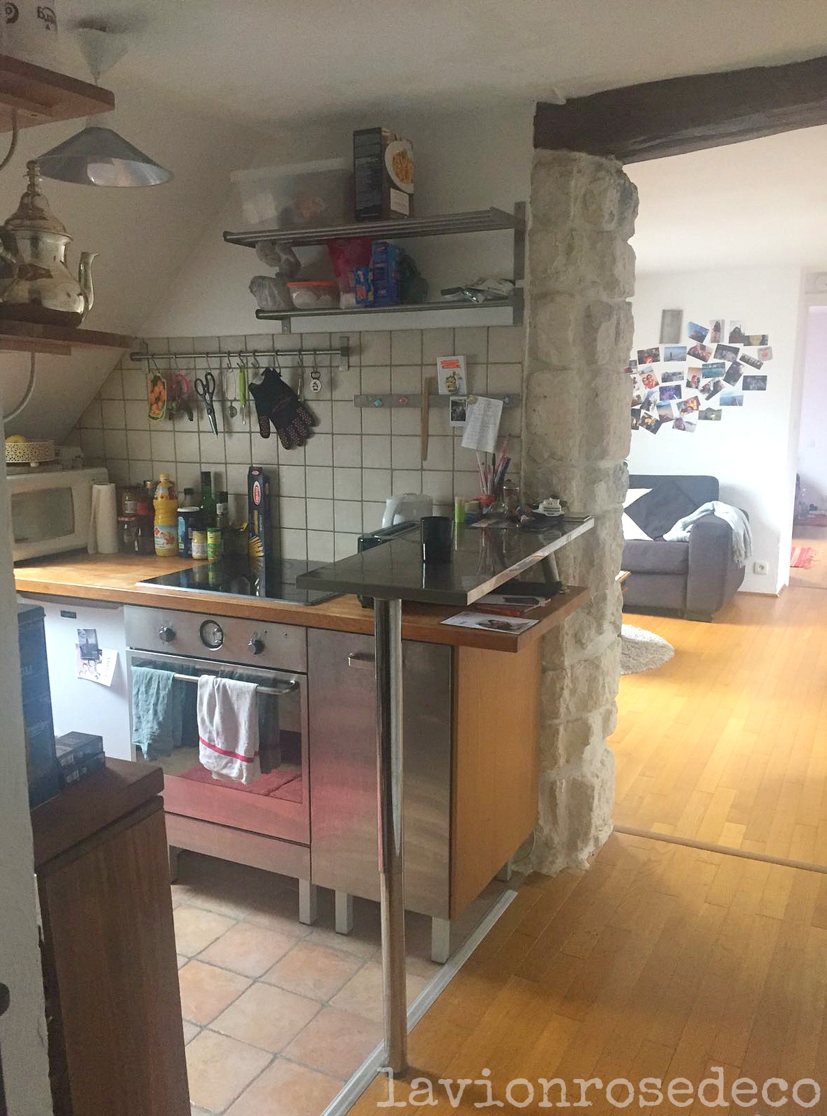 É num primeiro andar "a contar vindo do céu", com parede em pedra, vigas aparentes e porta de vidros coloridos, que mora a Zeyna. Do seu país natal, Marrocos, trouxe o colorido dos tapetes, a típica mesa baixa com bandeja de latão, bules e tajines. Mas mais do que isso, e é o que aprecio na casa de um jovem, trouxe a descontracção e a informalidade. Eu diria, a total liberdade de decorar inerente à pouca idade e ao início de vida. Uma falta de constrangimento que resulta em naturalidade: se não há molduras, as fotos vão diretamente para a parede num desenho abstrato; mesa de cabeceira não precisa existir, se há um pequeno tapete que supre as necessidades; e para que fim roupeiros fechados e sisudos se um carrinho expositor de loja os pode substituir? Na pequena cozinha, tudo à vista e à mão de semear para um quotidiano sem cerimónias. E parece que os objetos ganham o seu lugar com espontaneidade, apesar de na sala, uma planta estar estrategicamente colocada sob a luz generosa da janela. E se olharmos por essa janela? mais telhados sob os céus de Paris.