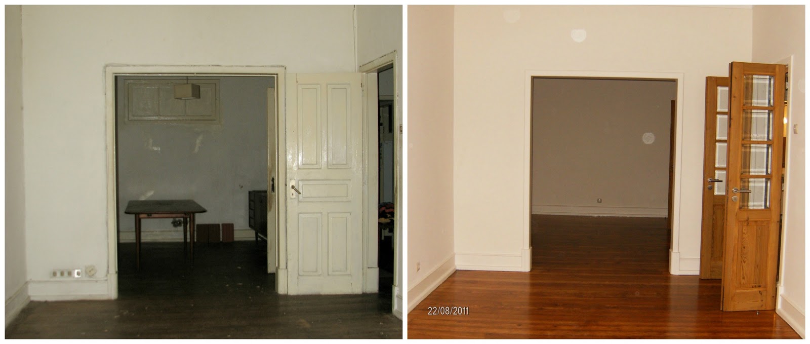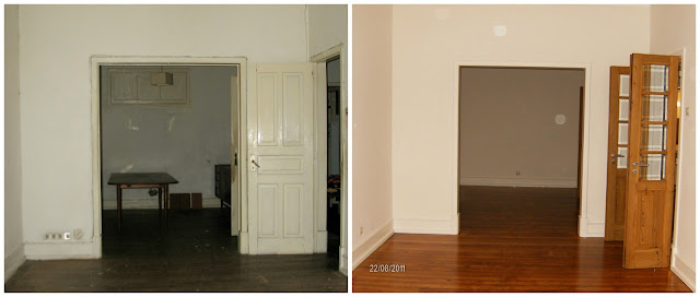 E sala de estar.Sem grande alardes,pois estava tudo lá,só à espera de ser valorizado:o pé direito com mais de 3 metros,a vistosa sanca do teto,o rodapé alto,o soalho,as portas em casquinha.