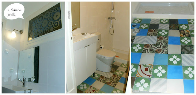 O piso é um patchwork de mosaicos hidráulicos o que além de original revelou-se uma boa opção por 2 razões:Como comprei literalmente os restos que estavam na loja,não tive que encomendar e esperar semanas que chegasse o material.E justamente porque eram sobras de outras encomendas,o fornecedor,para se ver livre das caixas de 1m2 de vários padrões que dificilmente iriam servir para algum trabalho,fez-me um preço super especial.Mais complicado,foi conjugar os desenhos e as cores,virtualmente,no meio da loja,sem poder abrir tudo e espalhar à vontade no chão.Mas pensando bem,essa é a parte em que a criatividade é chamada e a imaginação testada.