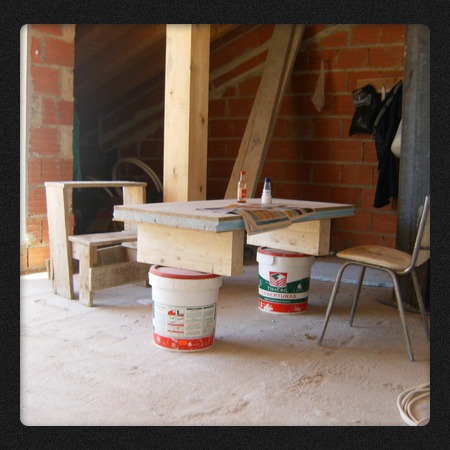 Baldes de massa e troços de madeira como apoio. O tampo? um painel sanduíche. Cavalete de um lado, cadeira do outro, e está pronta a sala de almoço em plena obra.