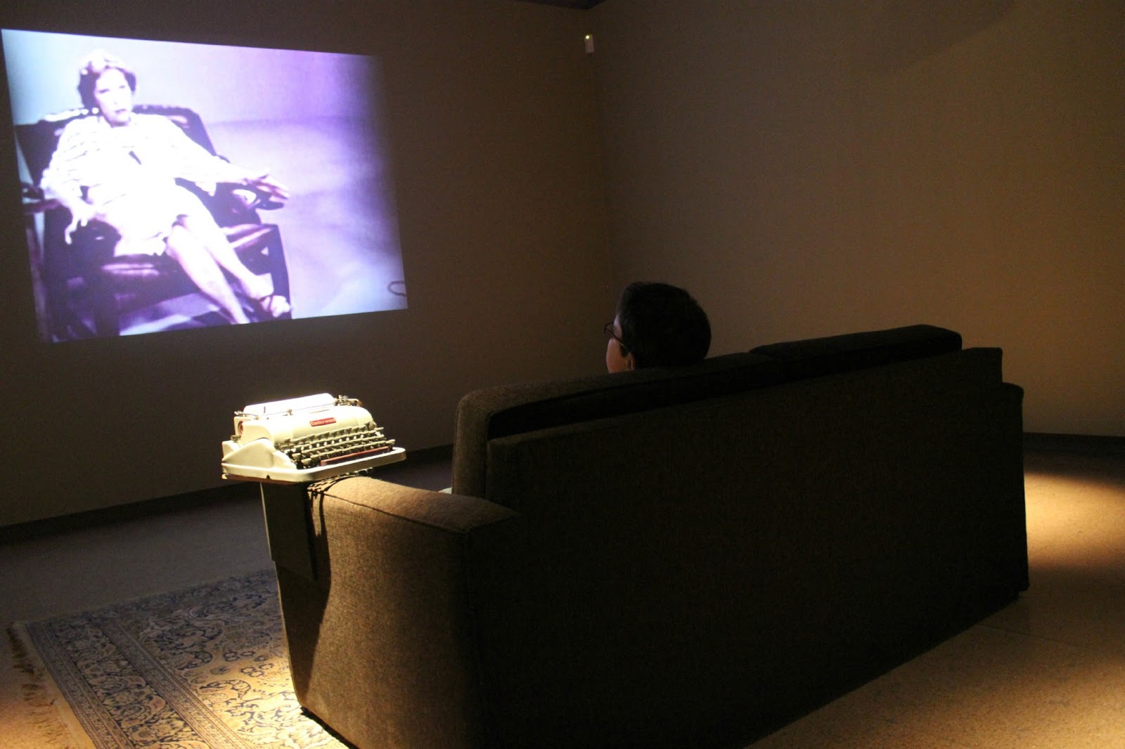A sala seguinte também foi para mim,inesperada:apenas uma tela onde passa a única entrevista que Clarice deu a uma televisão,um sofá,o pormenor do tapete,uma máquina de escrever e mais uma vez todo o dramatismo da iluminação.Dá vontade de ficar,e de ouvi-la,pois aqui,ela conversa com a visita.