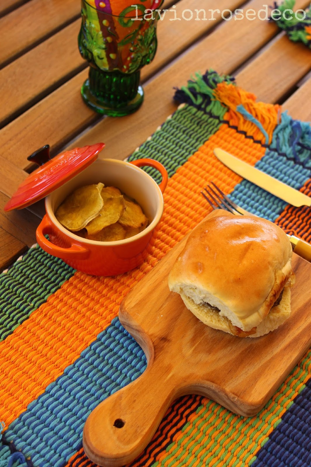 No fim de semana passado, houve almoço com os sobrinhos lá em casa. Uma espécie de adeus às férias e despedida entre os primos, que estudam ou trabalham quase todos fora. Agora, para se encontrarem novamente, na melhor das hipóteses, só pelo Natal. Como são todos jovens adultos, resolvi fazer alguma coisa descontraída. E como sou uma pessoa altamente influenciável pelos blogs que leio, quase nada saiu da minha cabeça. O prato principal foi "hamburgers com cebola caramelizada, servidos em pão brioche sobre pequenas tábuas de madeira". Ou seja, hamburger no pão. E ponto. Aqui esgotou-se a minha imaginação. Pois todo o resto foi plagiado no maior descaramento. Do blog da Camila, copiei a ideia das batatas servidas dentro das "cocottes", que mais não são do que pequenas caçarolas que dão um charme todo especial à mesa. Entretanto, já tinha ficado de olho nesta receita de chips da Regina. À falta de inhame, que não consegui mesmo encontrar, usei batata doce. E a sobremesa "de última hora" fui buscar ao Studio da Lu: um doce delicioso, super fácil e rápido de preparar. Aqui, um pequeno parêntese para salientar que quando chegou a este quesito, tive mais um rasgo de criatividade, e para personalizar o doce e divertir os sobrinhos, coloquei na mesa um expositor de "toppings".
