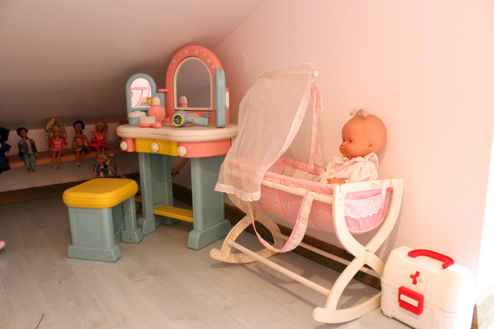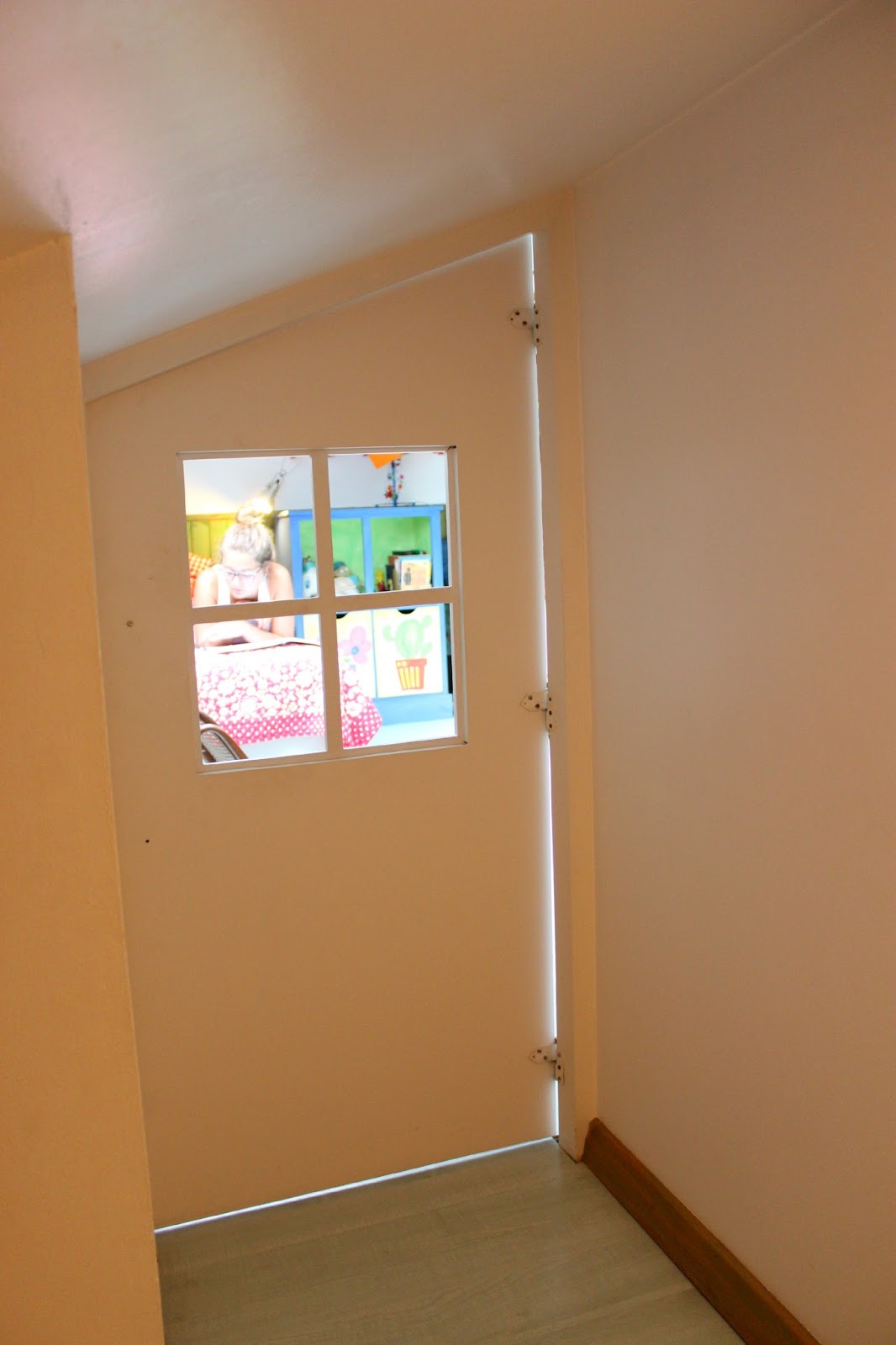 A casinha surgiu por acaso.Um dia que o apartamento ainda estava em obras,calhou de eu levar lá a minha filha mais velha,que teria então 3 ou 4 anos.Estávamos no local onde seria o quarto dela e da irmã e sobrava um espaço chato de solucionar,na continuação de onde iriam ficar os roupeiros.Quando a vi em pé nesse canto já tão baixo e esconso e que estava prestes a se tornar numa arrecadação,resolvi de repente que ali iria ser a casa de bonecas que todas as meninas desejam.